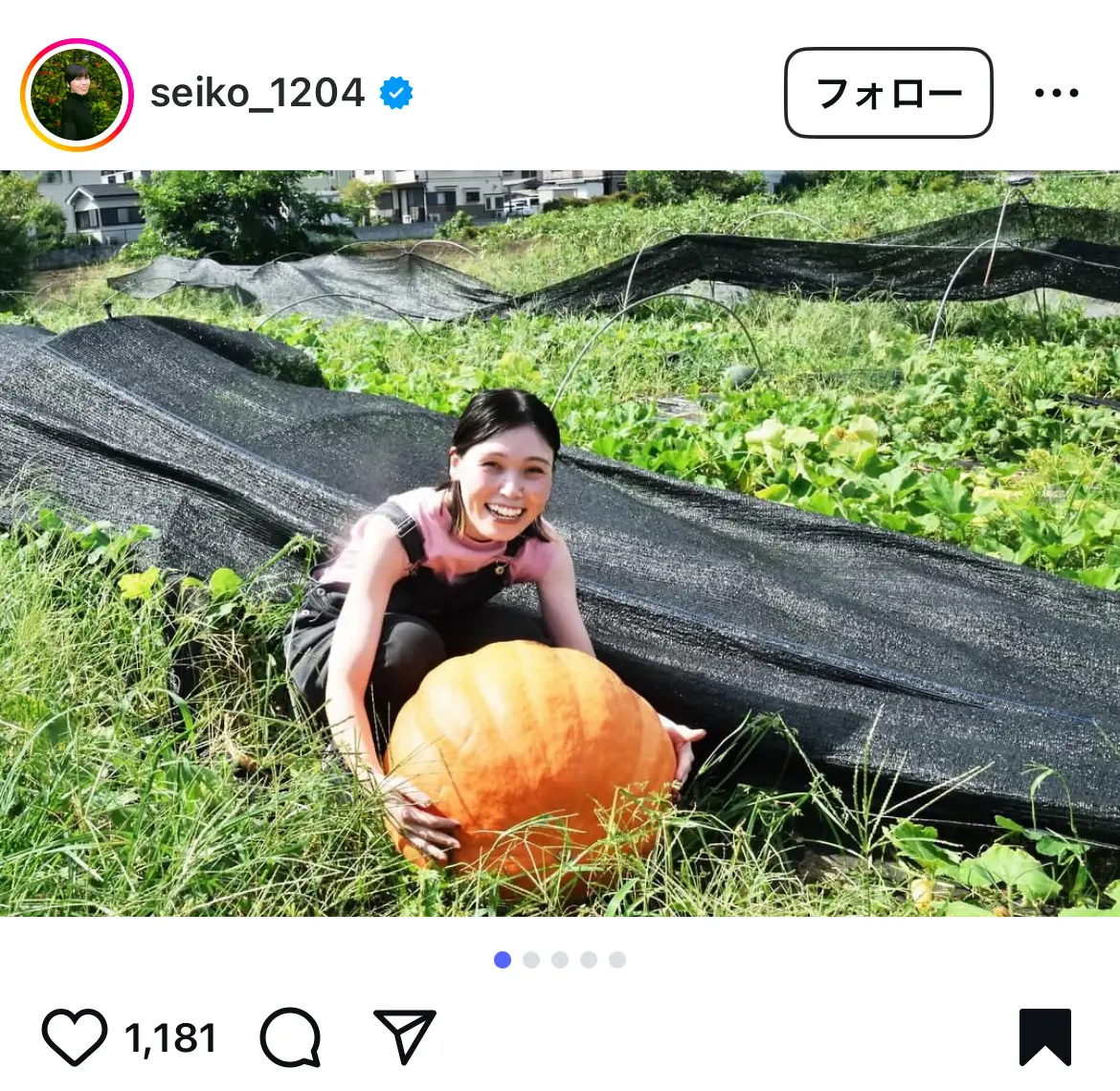 Instagramには、農園で楽しむ誠子さんの笑顔が印象的な写真が5枚投稿されており、充実した日々が伺えます。