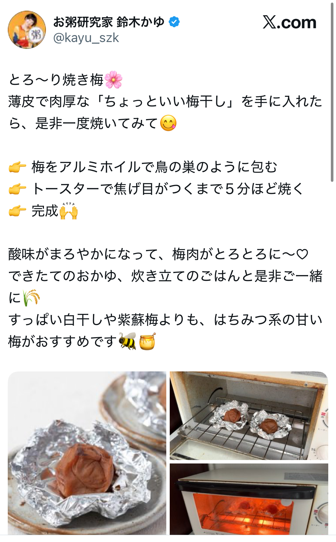 投稿では「とろ〜り焼き梅 薄皮で肉厚な「ちょっといい梅干し」を手に入れたら、是非一度焼いてみて」とおすすめしていました。