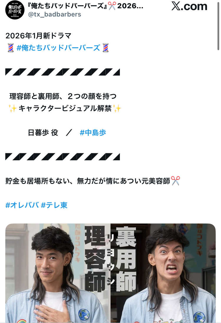 投稿では、「理容師と裏用師、2つの顔を持つ」というキャッチコピーと共に、中島さんが演じる日暮歩のキャラクタービジュアルが解禁されました。
