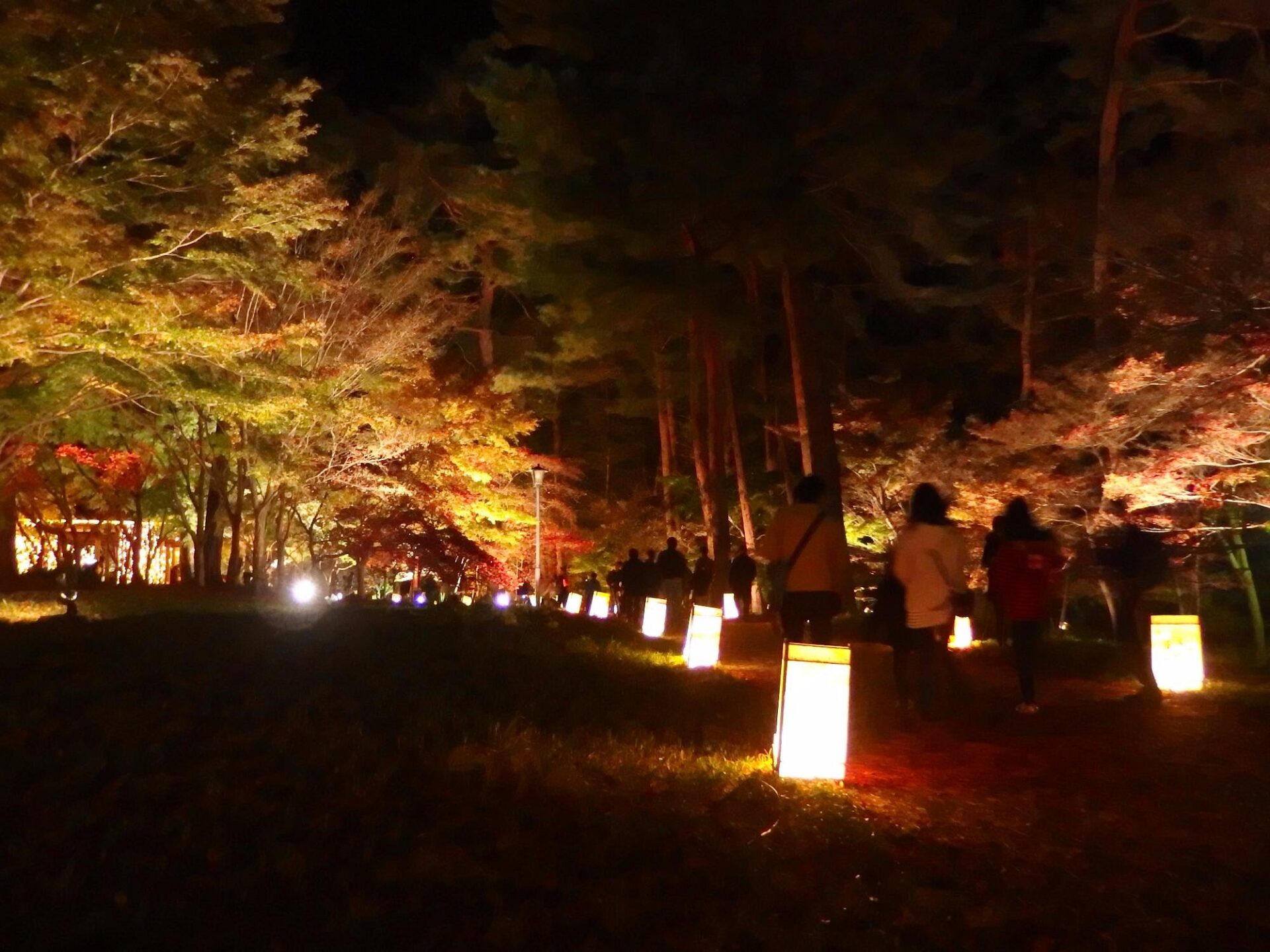 カエデ園の木々が色鮮やかにライトアップされ、昼間とは全く違う幻想的な空間が広がります。