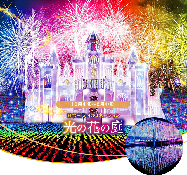 日本を代表するイルミネーションの一つとして知られ、500万球を超える光が園内を彩る様子は圧巻の一言。特に、藤の花を再現した「奇蹟の大藤」は、まるで光のシャワーを浴びているかのような幻想的な美しさです。