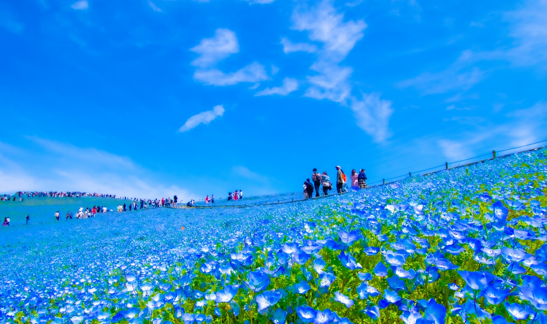 茨城県ひたちなか市にあるこの公園では、4月中旬になると約530万本ものネモフィラが丘を青く染め上げます。