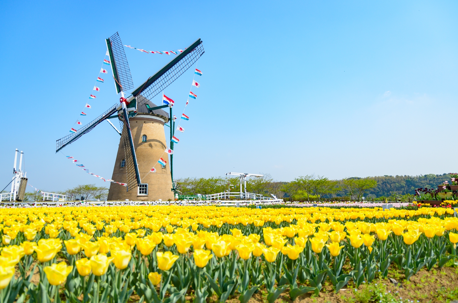 4月には「チューリップフェスタ」が開催され、風車を背景に色とりどりの花が一面に咲き誇り、まさにキャンバスに描かれたアートのような景観。