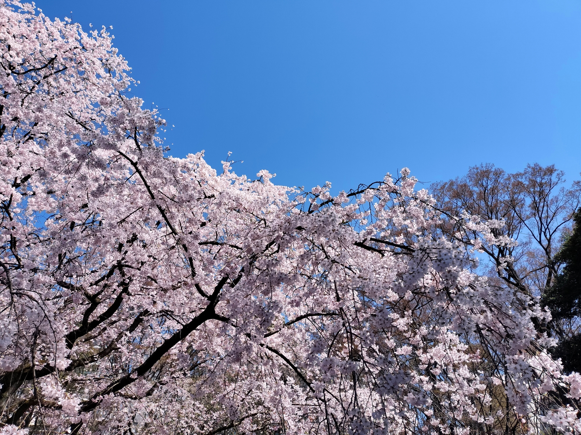 枝から薄紅色の花が流れ落ちる様子は、まるで光り輝く滝のような圧倒的な美しさ。