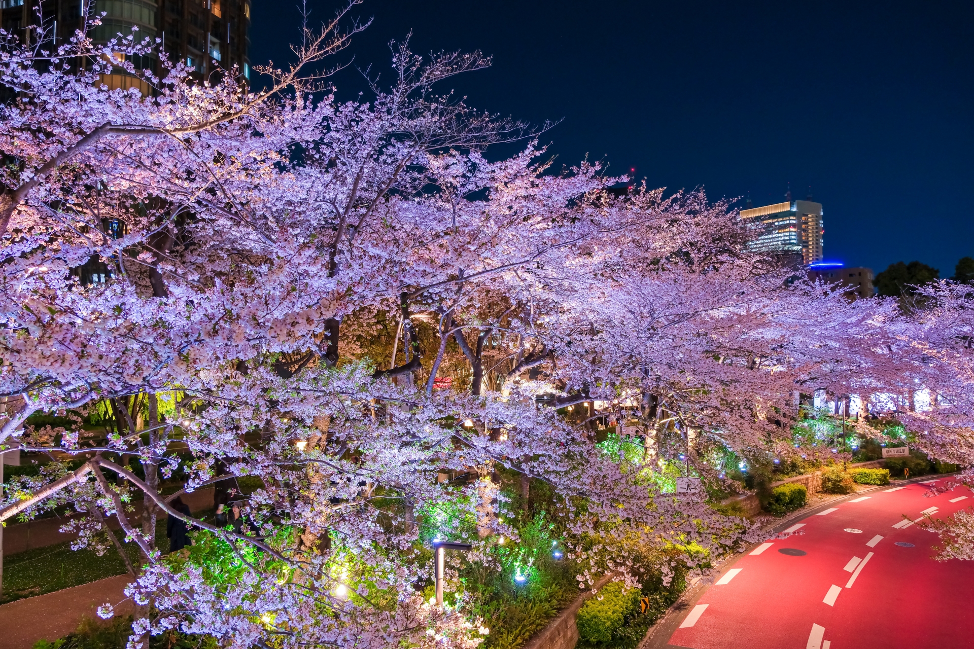 夜は桜並木が幻想的にライトアップされ、高層ビル群の夜景と桜が融合したスタイリッシュな景色を堪能できますよ。