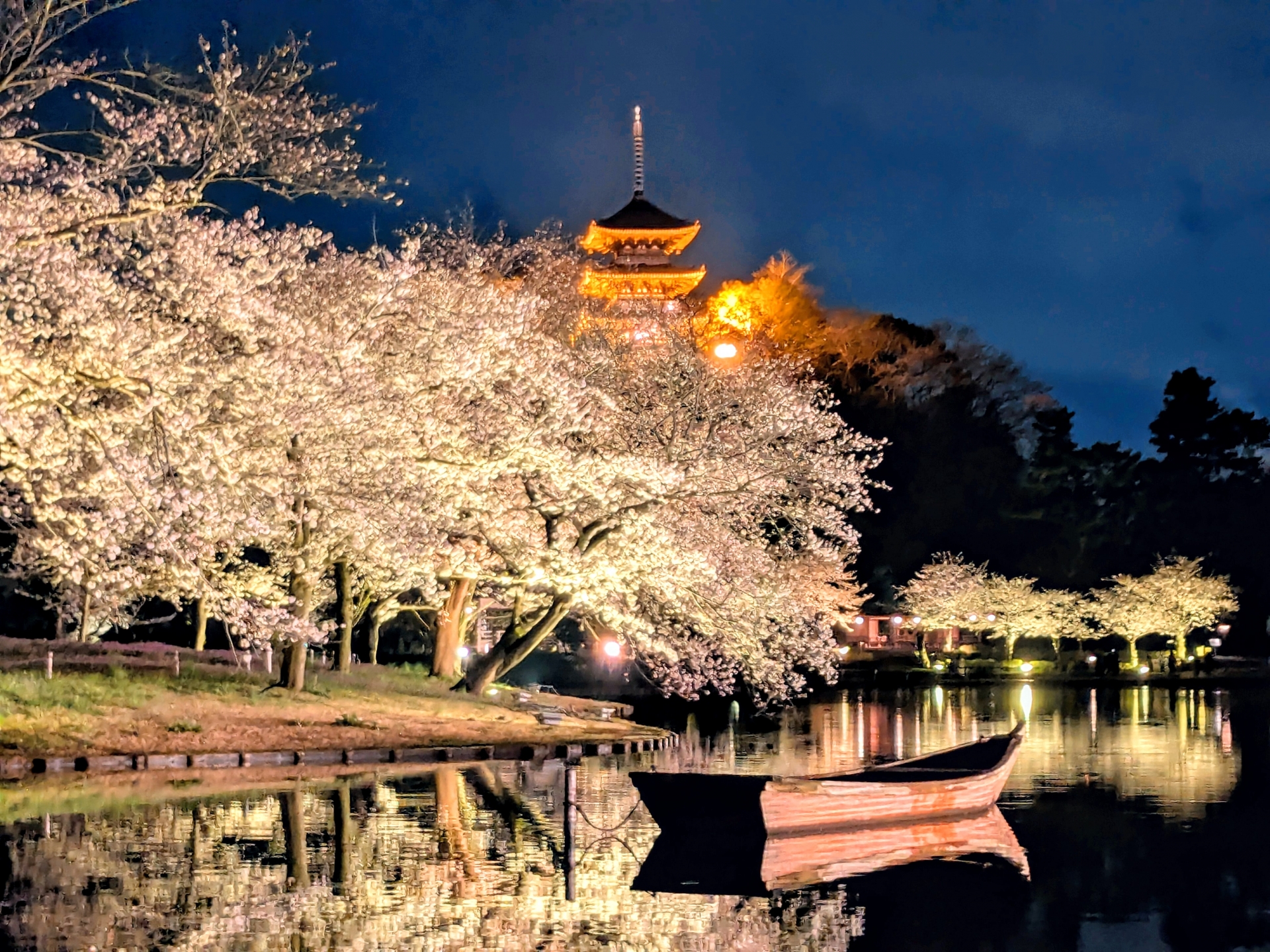 夜間はライトアップも実施され、闇夜に浮かび上がる三重塔と桜の共演は、まさに現実を忘れるような幻想的な光景です。