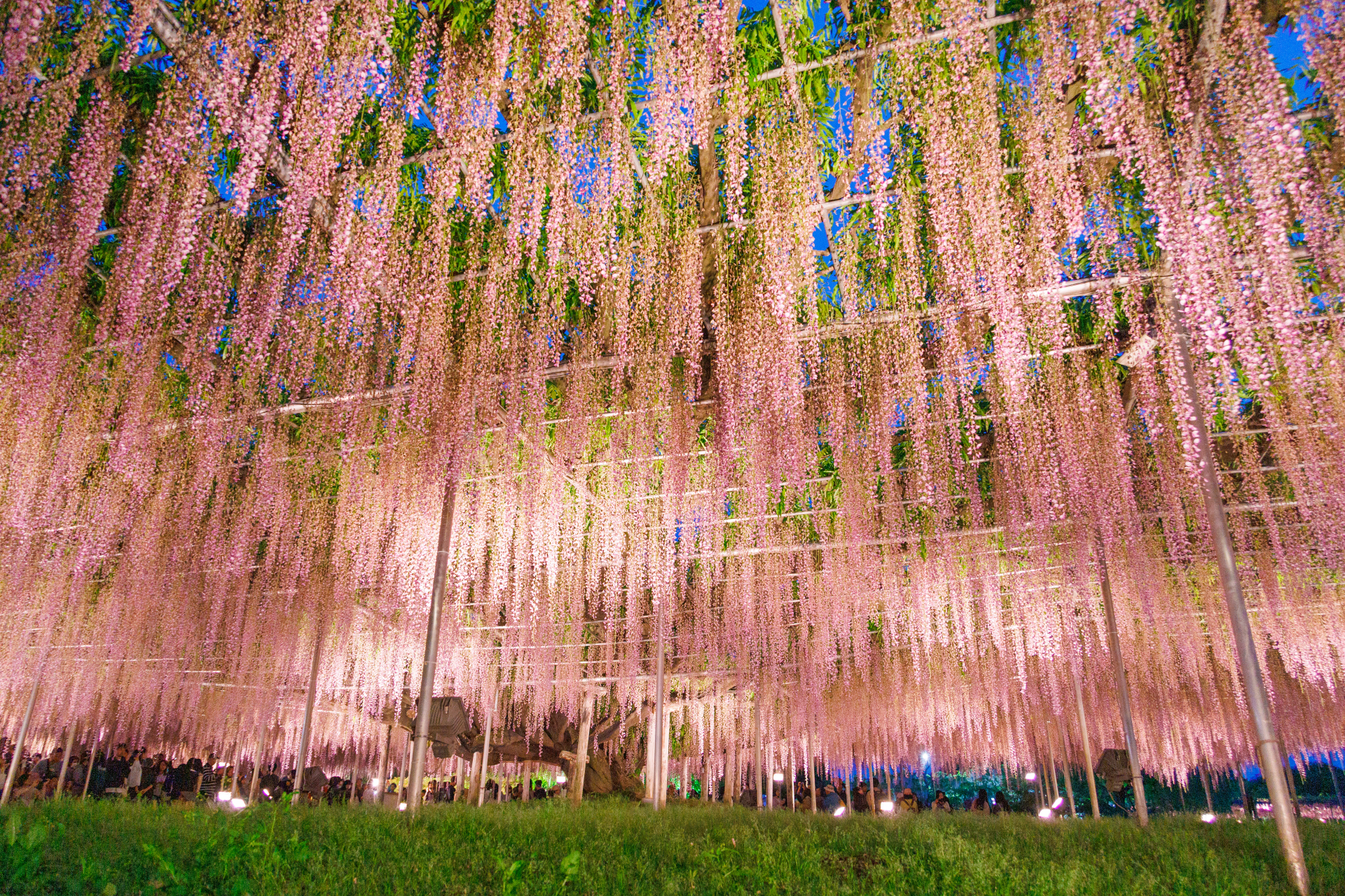 世界からも注目を集めるこのパークでは、春になると350本以上の藤が咲き誇り、まるでシャンデリアのような大藤棚が現れます。