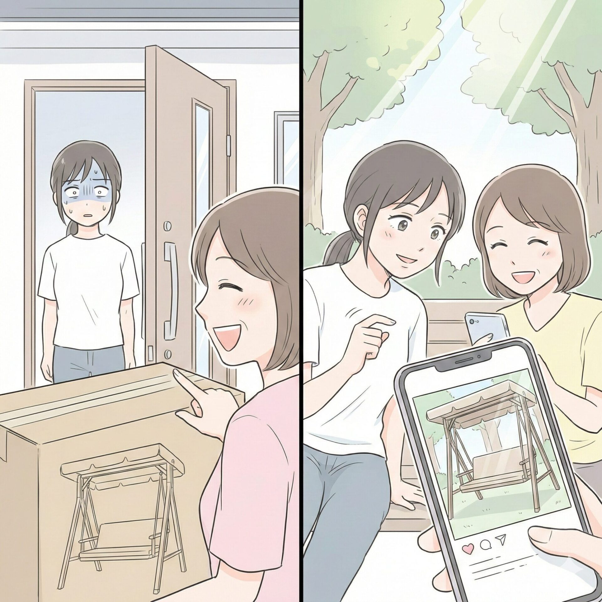 「この前、欲しいねって言ったでしょ?でも私の家の庭は狭いから、これ、あなたの家の庭に置かせてもらってもいい?組み立てるのも大変だから、旦那さんに組み立てほしいの」