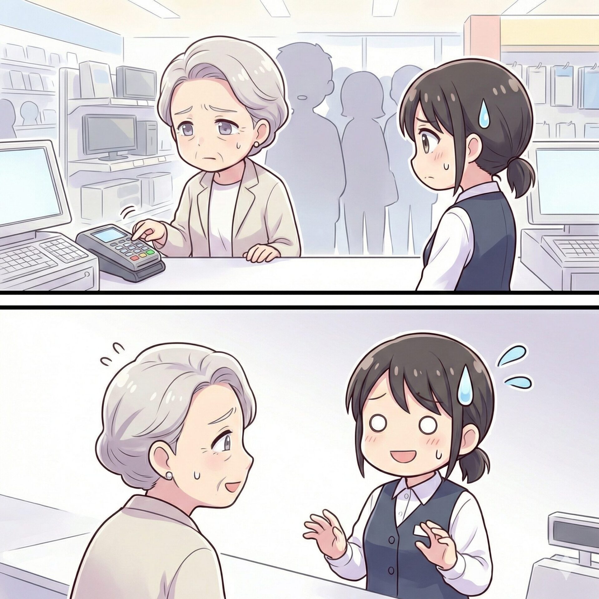 背後には次のお客様も並び始め、レジ周辺には少しずつ焦燥感が漂い始めます。