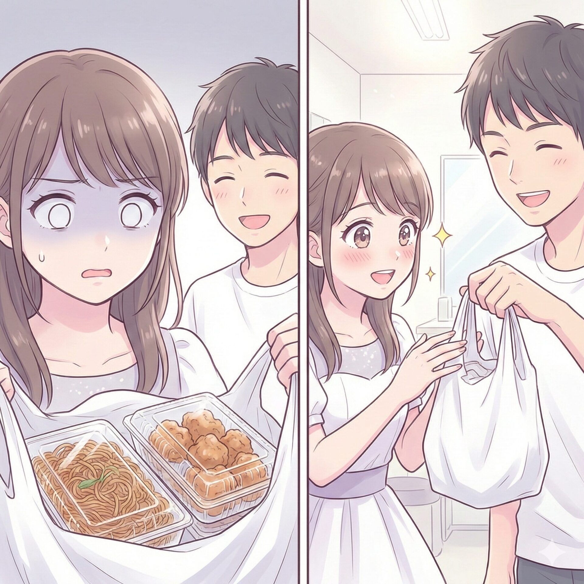 片付けをしている私の元へ、友人が満面の笑みで駆け寄ってきました。手には、白いレジ袋に入った何かが握られています。