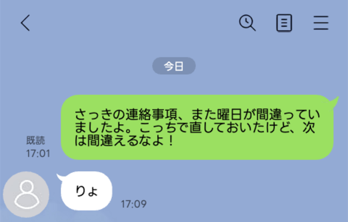 「さっきの連絡事項、また曜日が間違っていましたよ。こっちで直しておいたけど、次は間違えるなよ!」