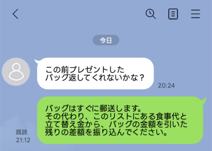 「バッグはすぐに郵送します。その代わり、このリストにある食事代と立て替え金から、バッグの金額を引いた残りの差額を振り込んでください。」