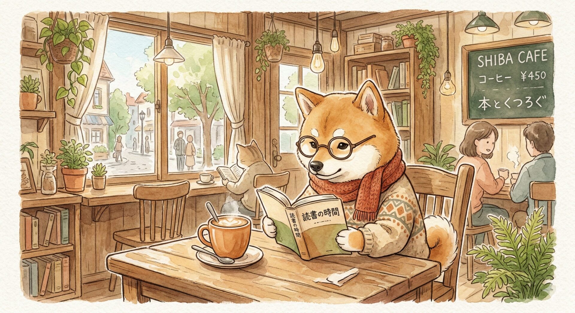 プロンプト:カフェでコーヒーを飲みながら本を読む、眼鏡をかけた可愛い柴犬。水彩画風の温かみのあるタッチ。