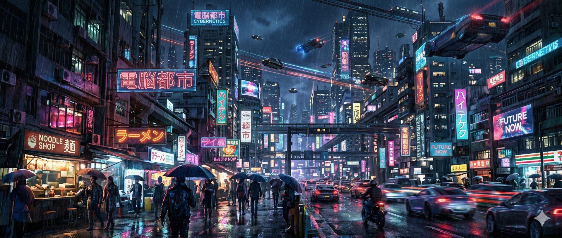 プロンプト:サイバーパンク風の未来都市。ネオンの光、雨に濡れた道路、空飛ぶ車。高画質で映画のような構図。