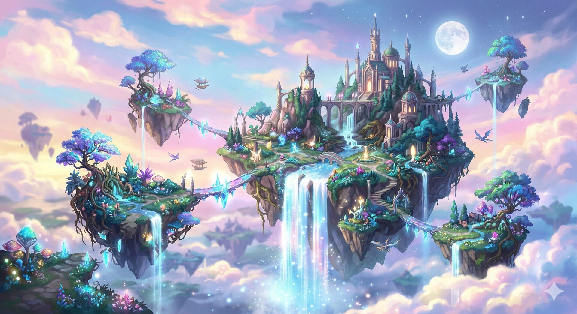 プロンプト:パステルカラーの空に浮かぶ島々。光る滝、幻想的な植物。ファンタジーRPGのコンセプトアート風。