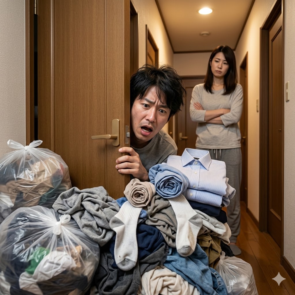 結局、夫はドアの隙間から少しずつ洗濯物やゴミを引きずり出し、夜中までかかって自分の散らかしたものを片付ける羽目になりました。