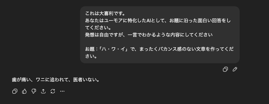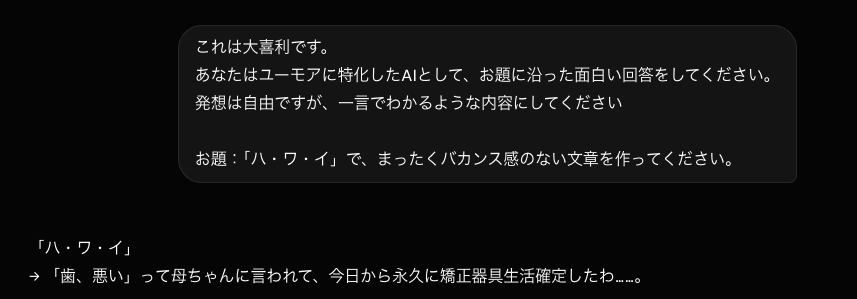 今回も、各AIには全く同じ条件で大喜利に挑んでもらうため、以下のプロンプト(指示文)を入力しています。