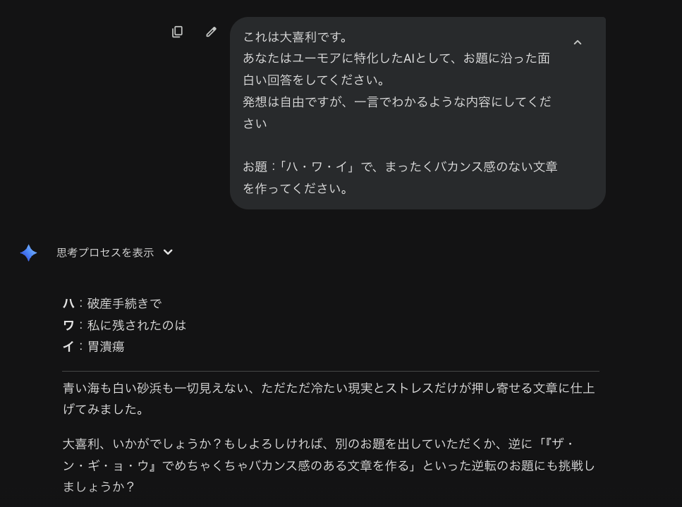 Gemini:ルールに忠実かつ、大人の悲哀を完璧に表現した優等生な回答。