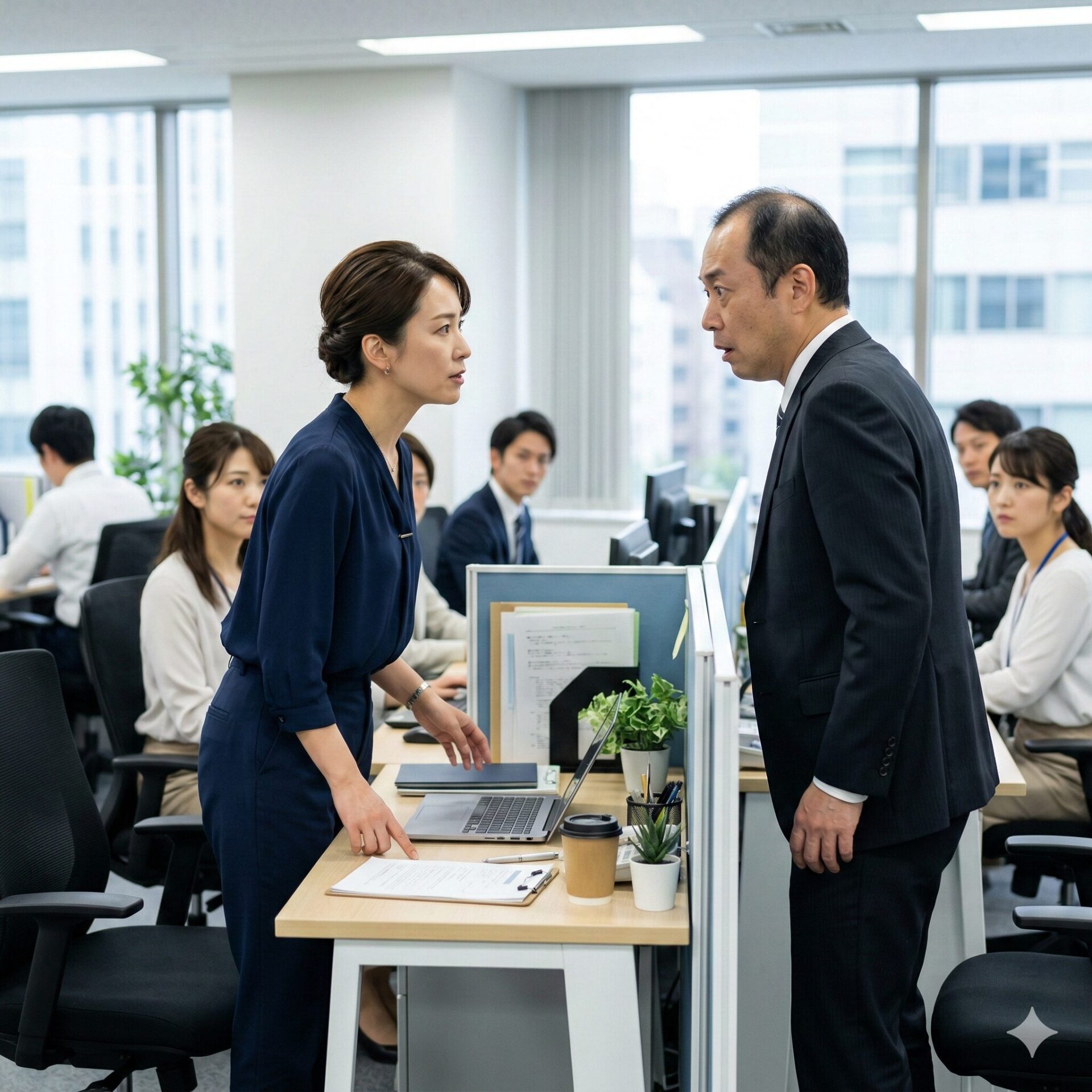 周囲の同僚たちが、息を詰めて事の成り行きを見守っているのが肌で感じられます。上司は明らかに狼狽し、視線を宙に泳がせました。