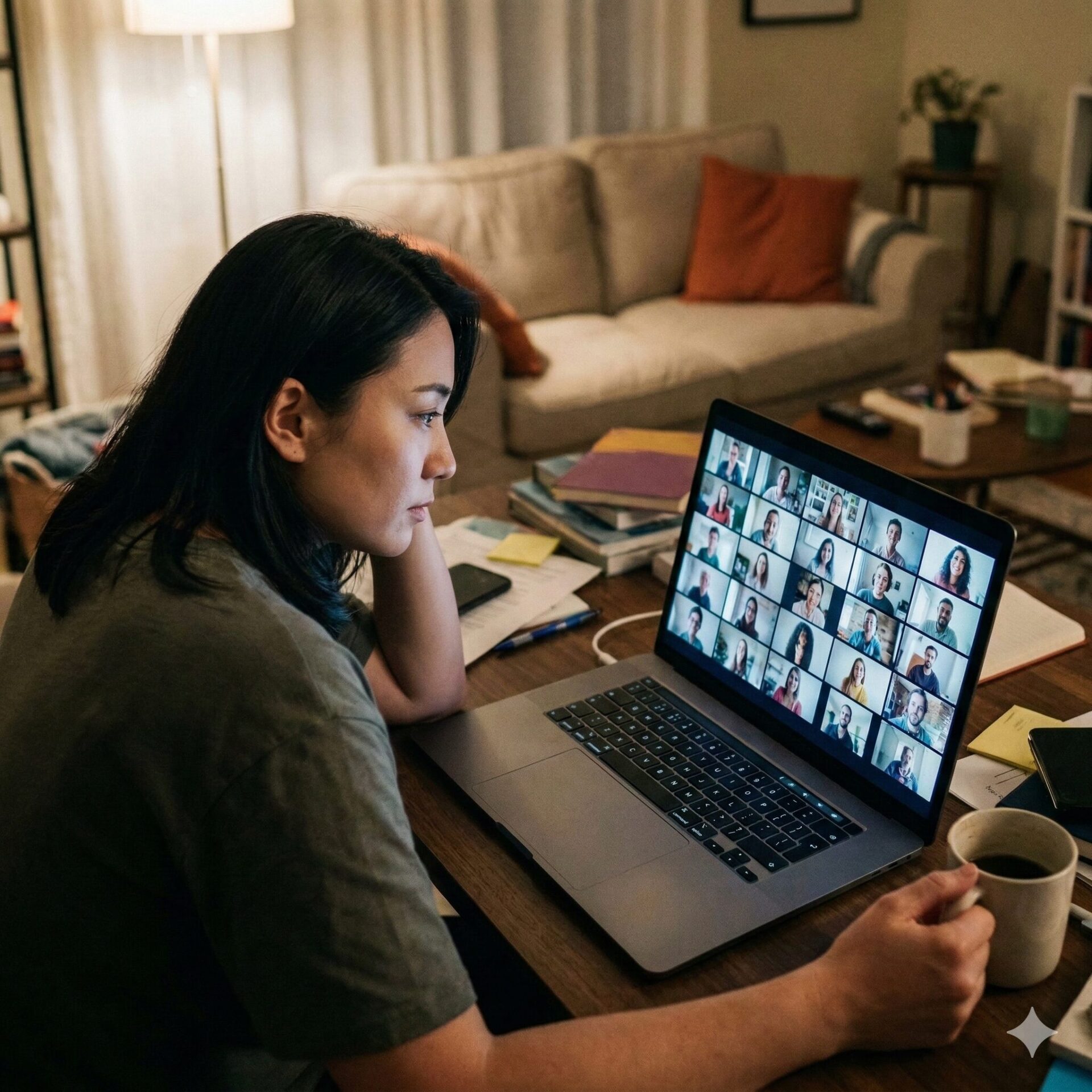 画面の向こう側に並ぶ、無表情な同僚たちの顔。
