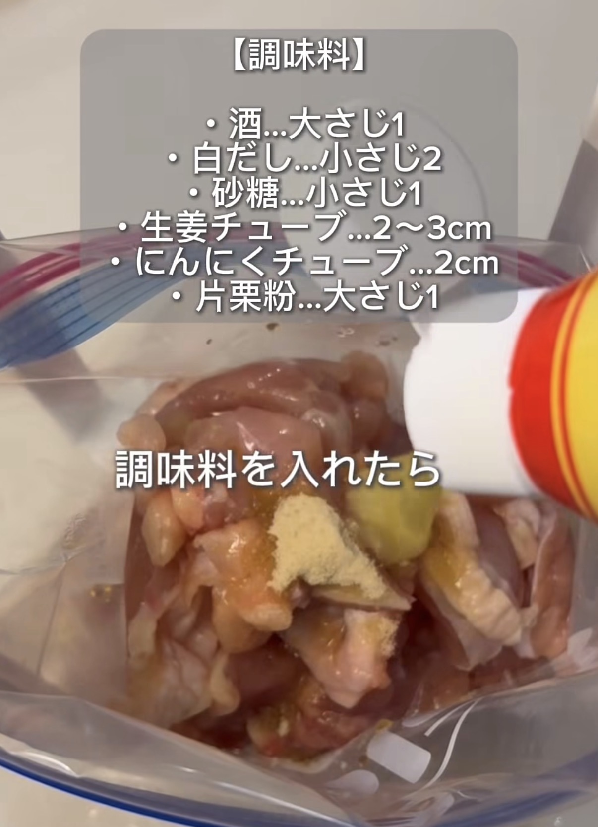 そこへ【下味用調味料】をすべて入れ、袋の上からよく揉み込みます。