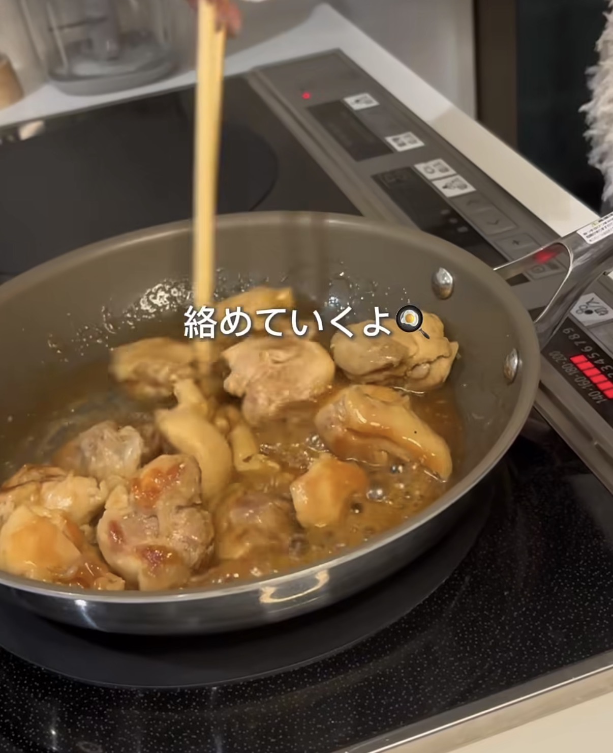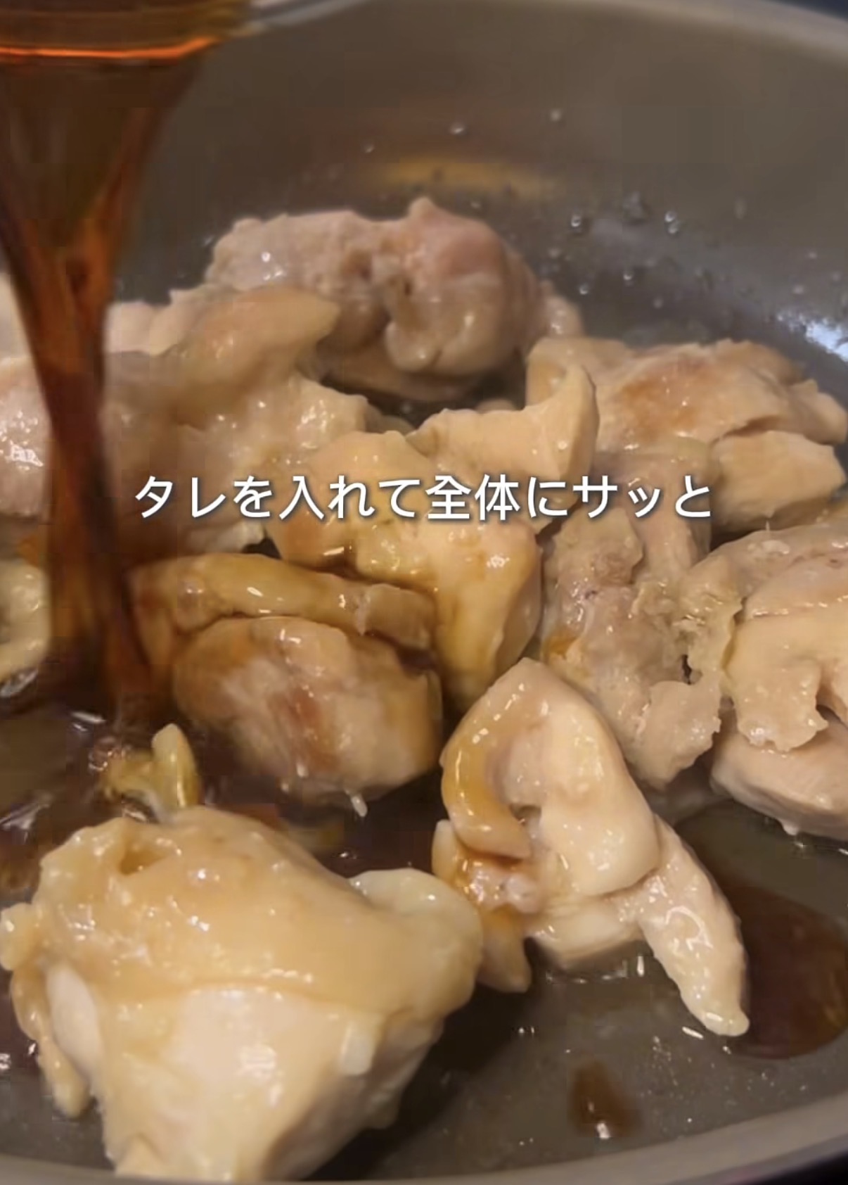 お肉の中までしっかり火が通ったら、【調理時のタレ】を入れて全体に照りが出るまで絡めます。