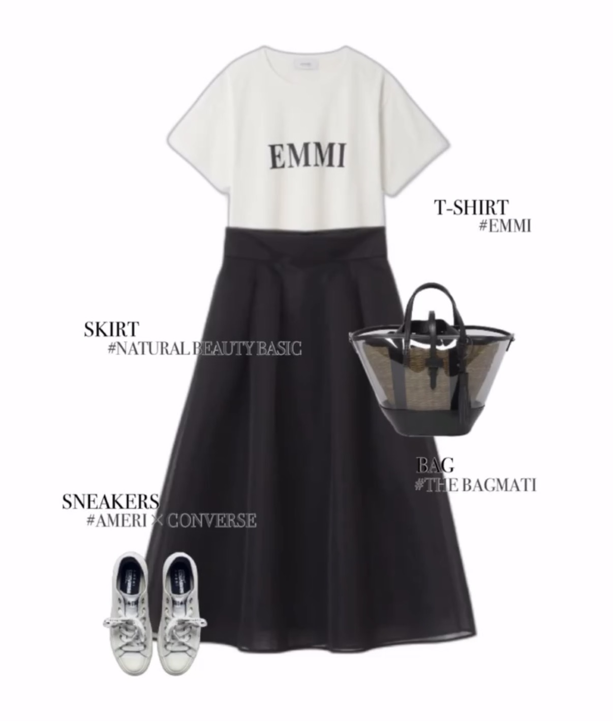EMMIのクリーンなロゴと、THE BAGMATIのクリアなカゴバッグが、夏らしい抜け感を演出します