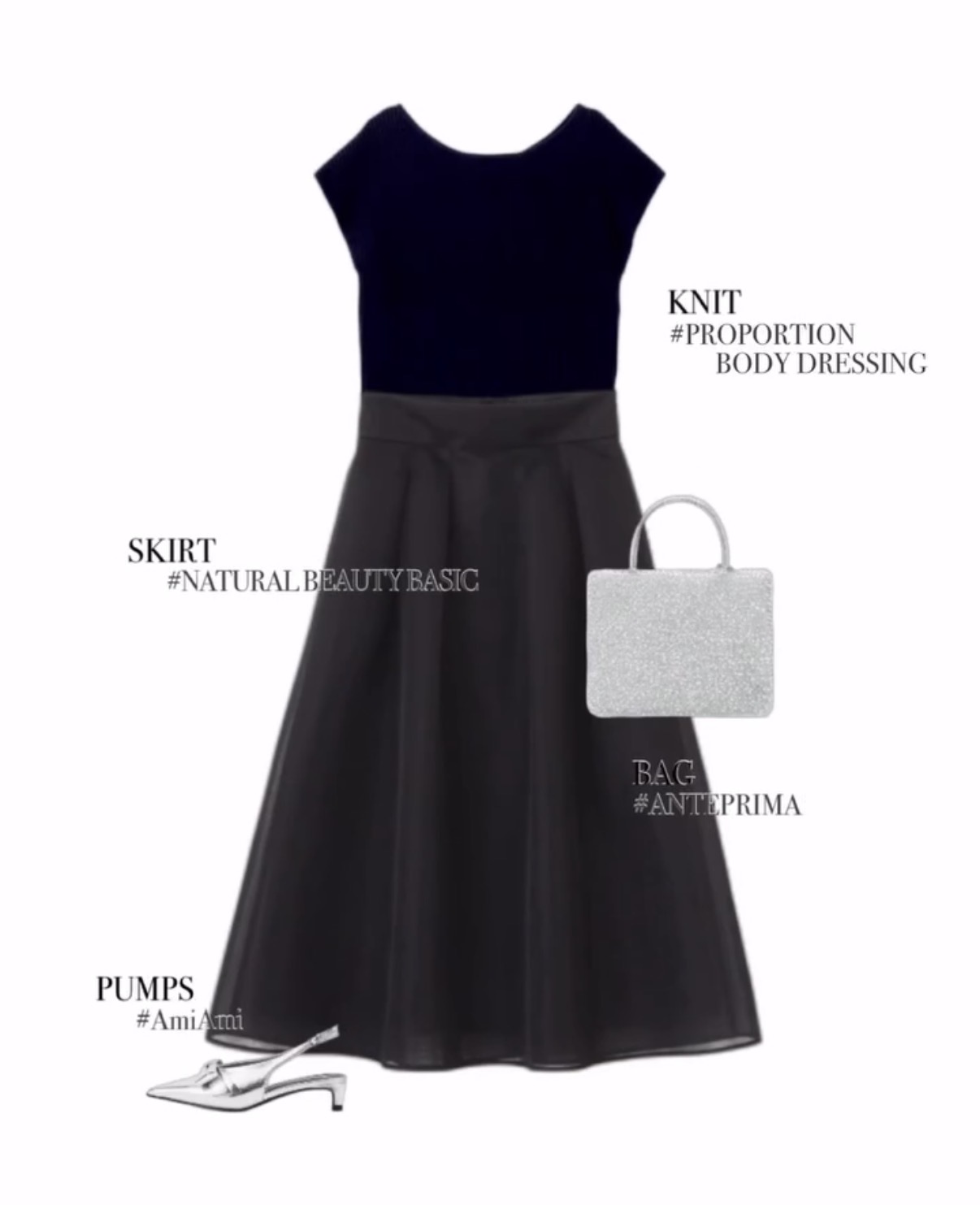 そこにANTEPRIMAのワイヤーバッグとシルバーのパンプスで光を足すのが、地味見えしないコツです。