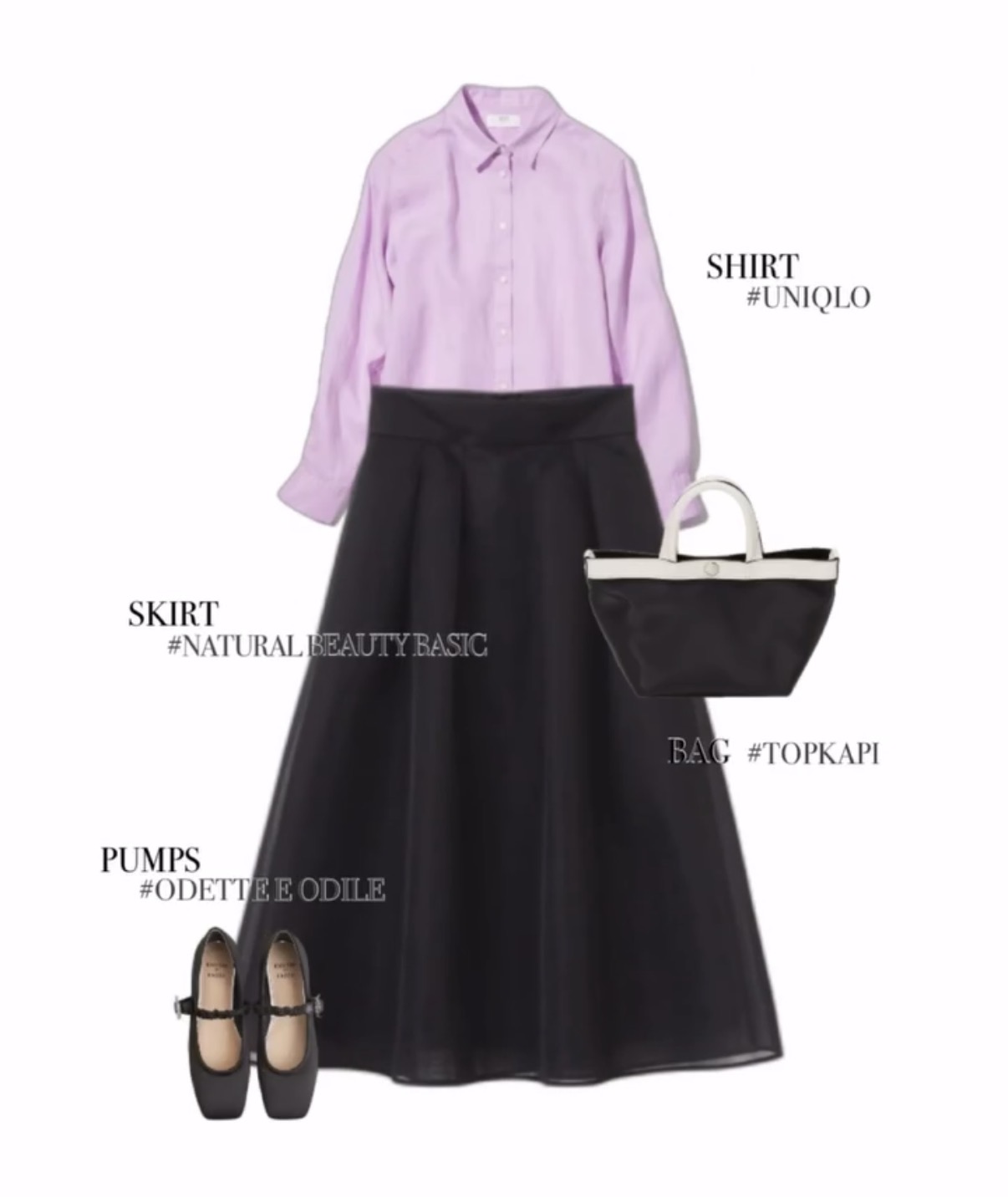 春の陽射しに映えるラベンダーのシャツは、実は黒スカートと相性抜群。