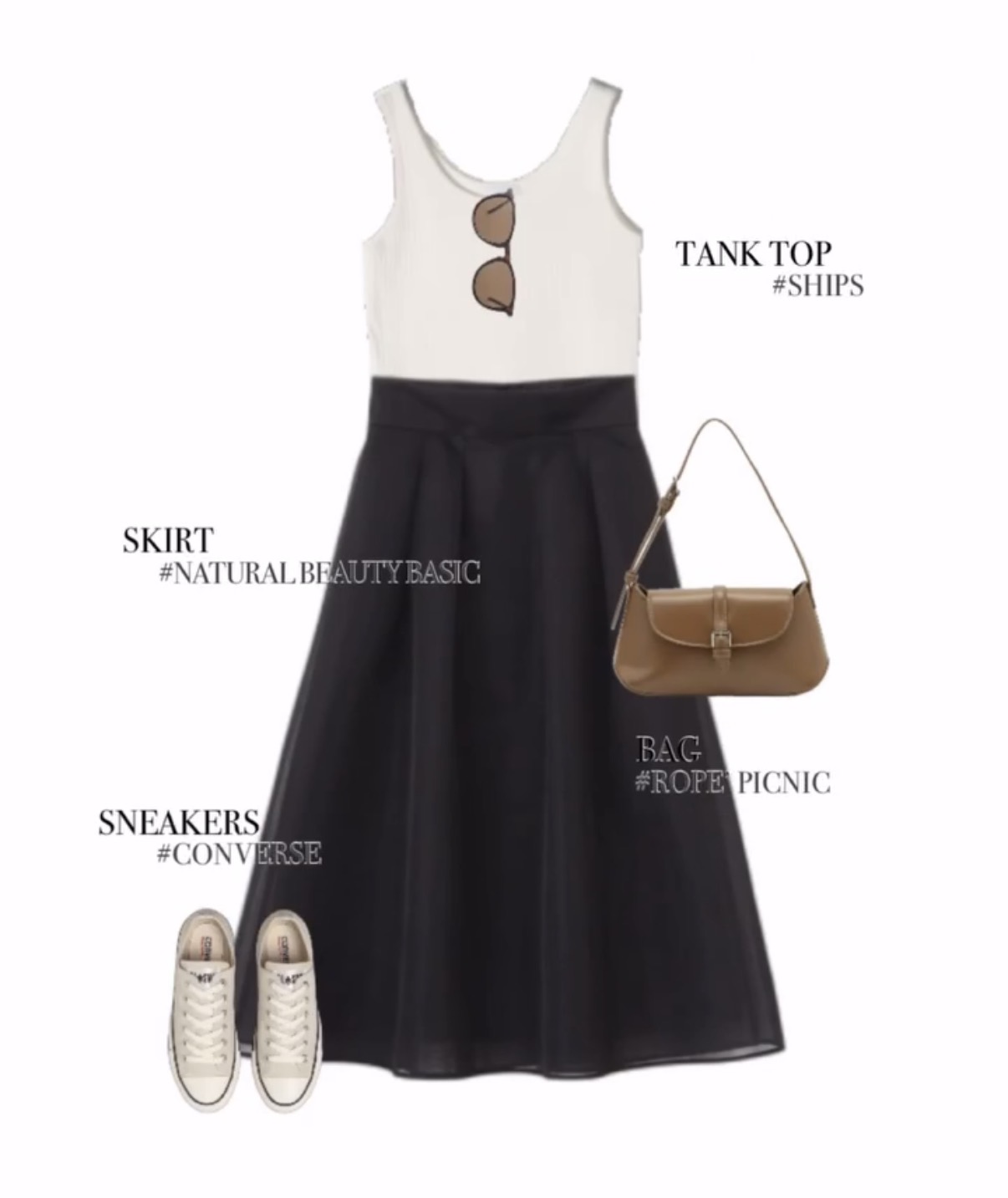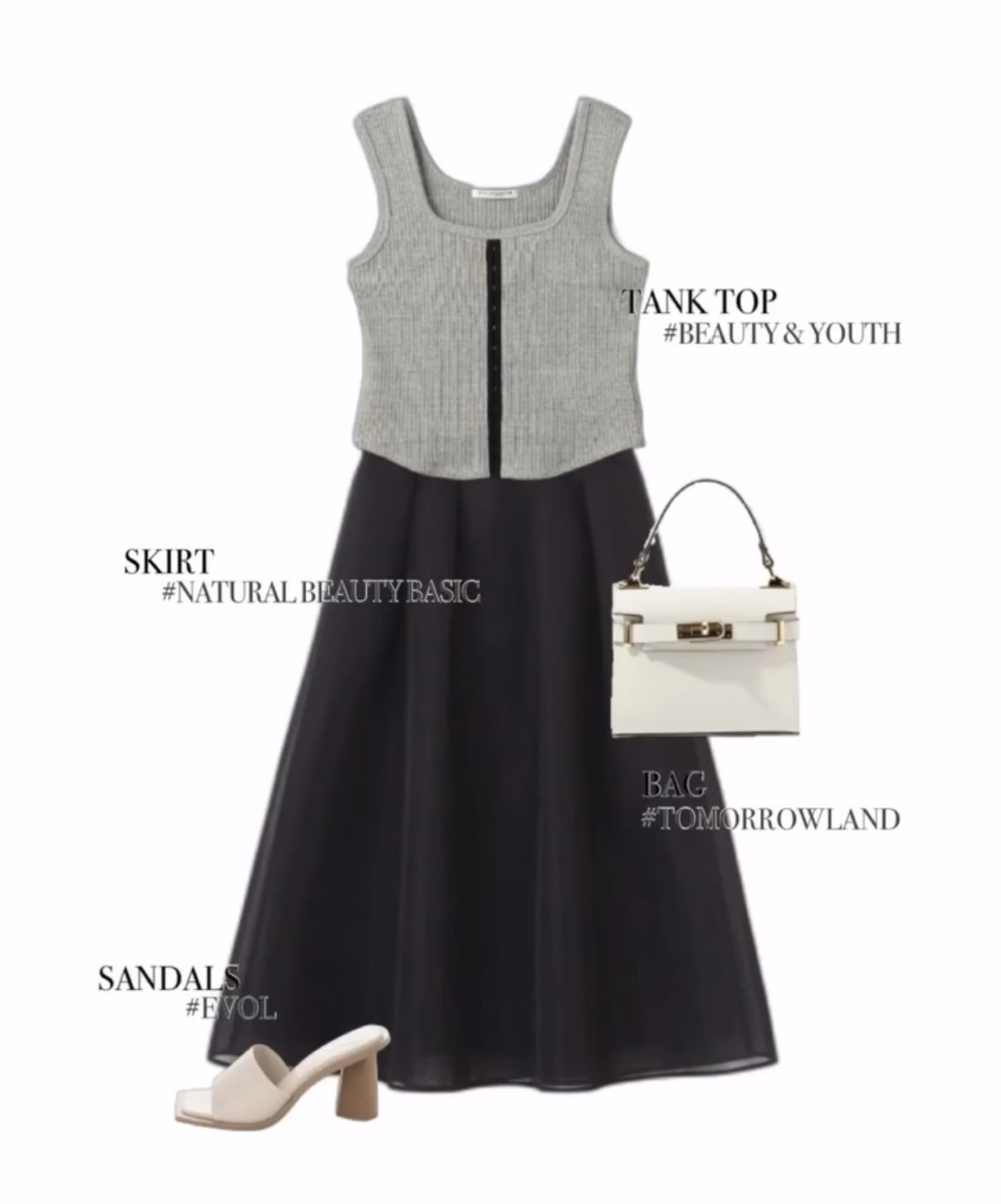 デザイン性の高いタンクトップで、スカートの表情をガラリと変えて。