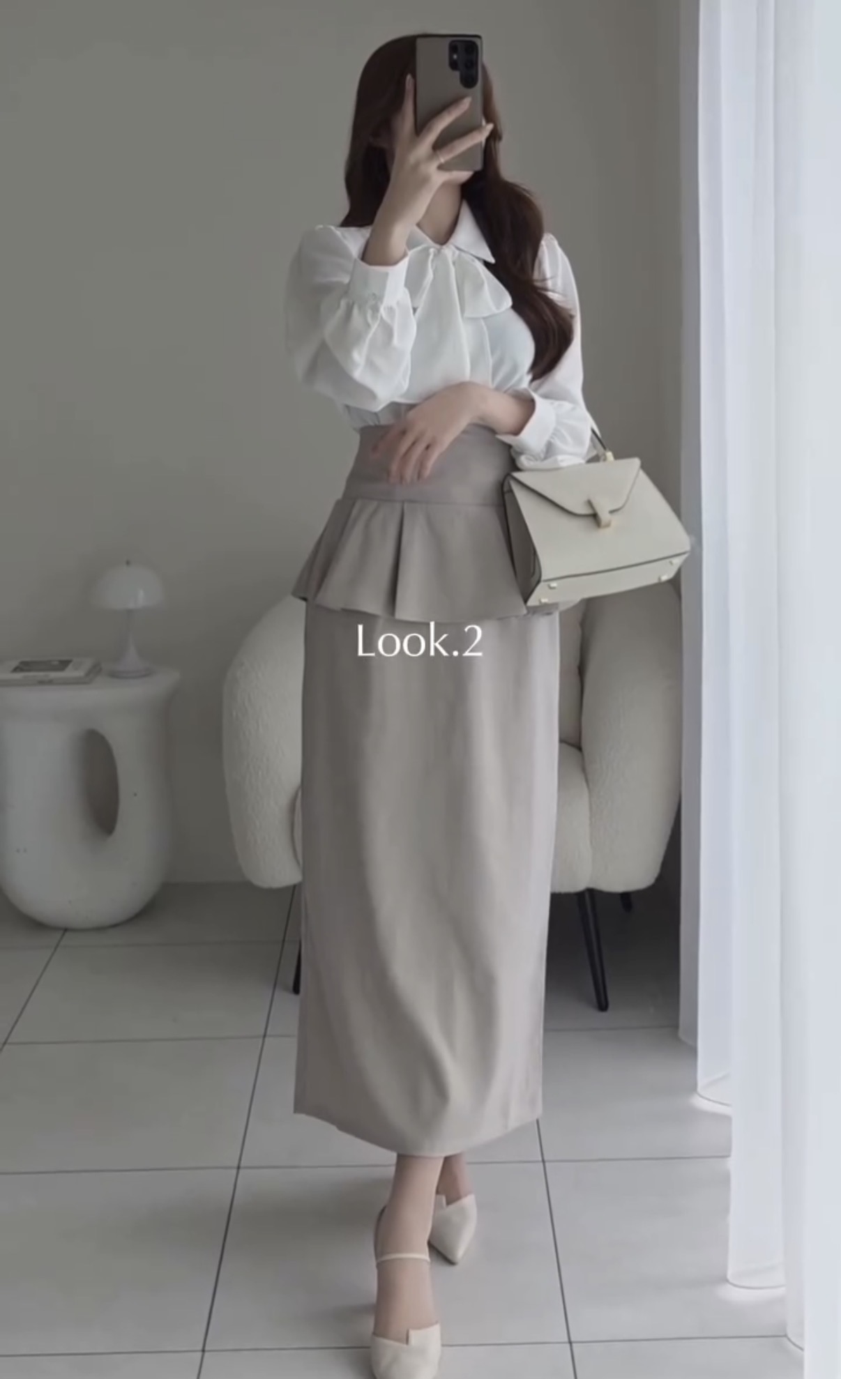 【Look 2】着るだけでくびれ誕生!「ファスナー付きペプラムナロースカート」