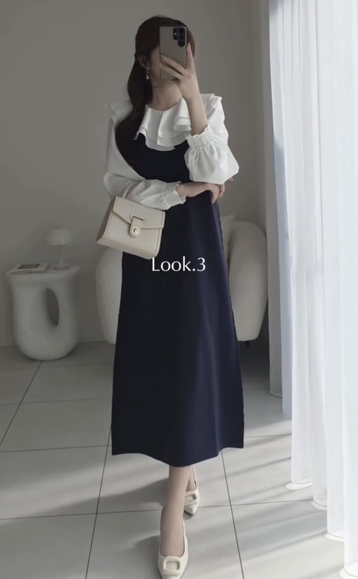 【Look 3】1枚で主役級の可愛さ。「衿元フリル異素材ドッキングワンピース」