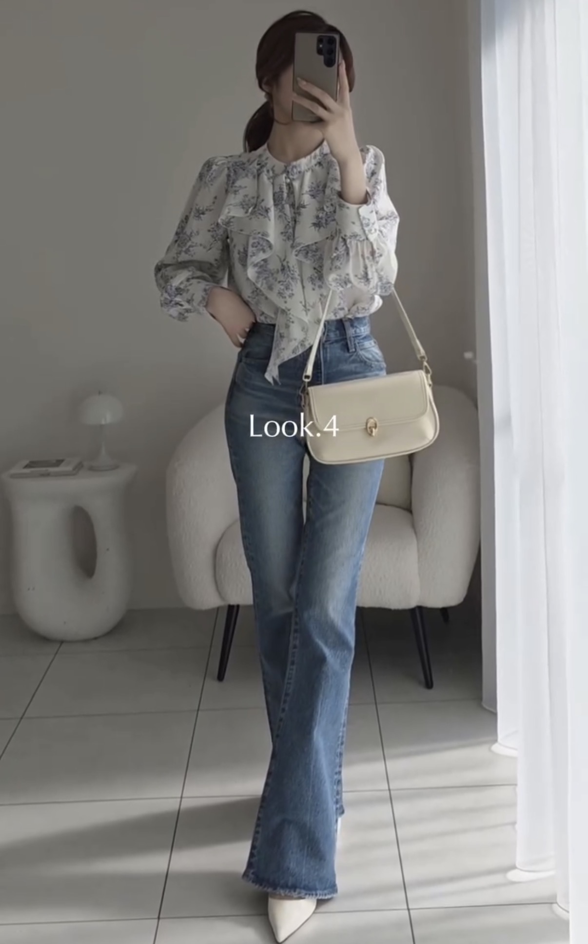 【Look 4】華やぎを添える「フラワープリントパールフリルブラウス」