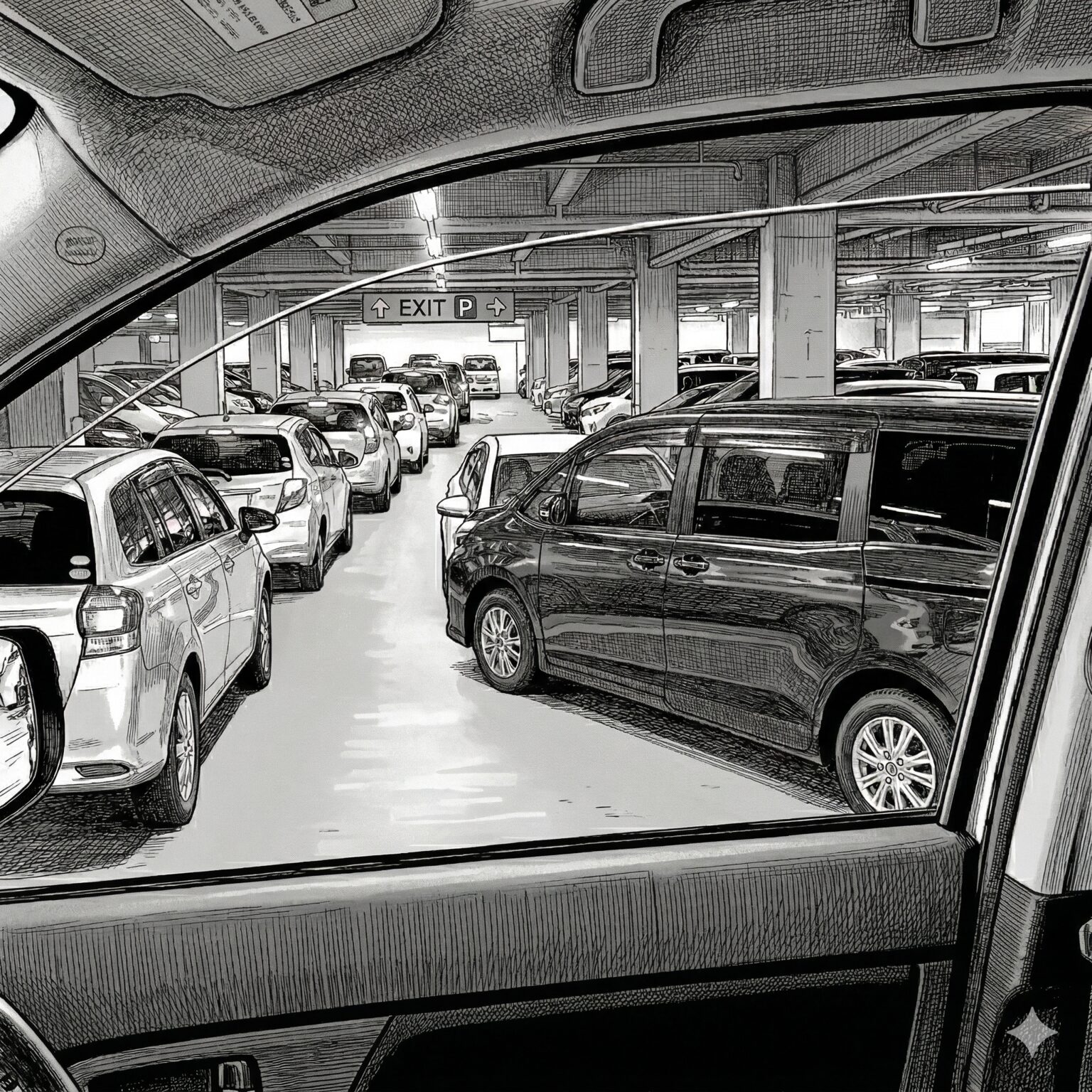 上階へと続くスロープには、カタツムリのようなスピードでしか進まない車の列が延々と連なっていました。