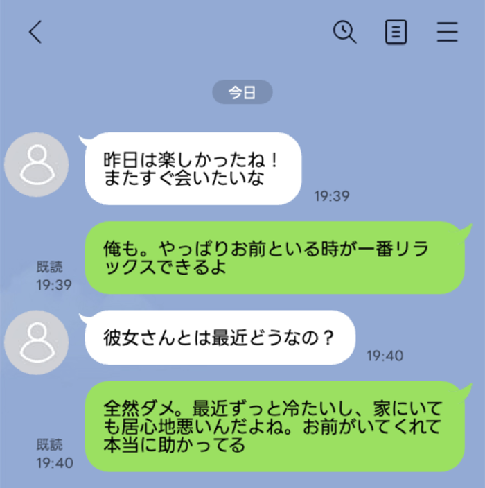 彼「全然ダメ。最近ずっと冷たいし、家にいても居心地悪いんだよね。お前がいてくれて本当に助かってる」