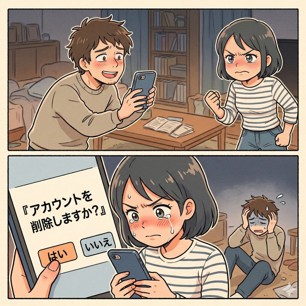 画面に浮かび上がる『アカウントを削除しますか?』の警告文。