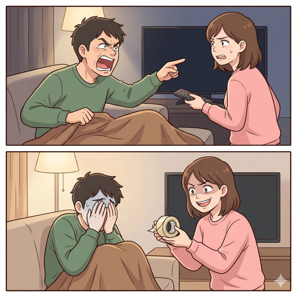 テレビつけっぱなしで寝落ちする夫。消そうとすると「今見てたのに!」と怒鳴るので仕返しをした