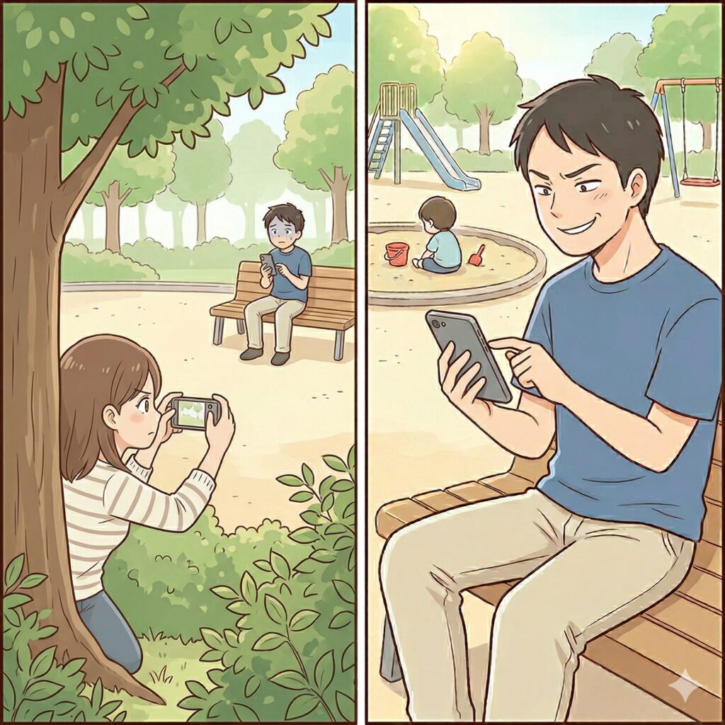 でも、帰ってきた子供の服は全く汚れておらず、「パパ、ずっとスマホ見てた」と不満げな顔。