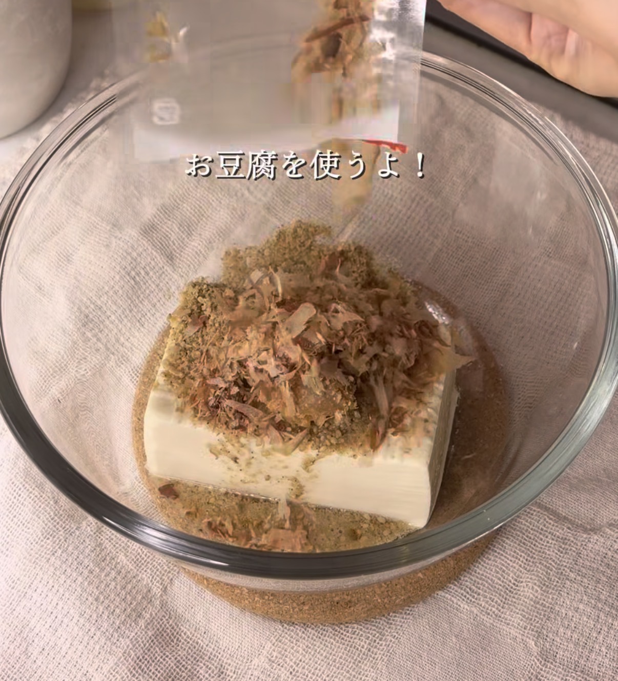 ボウルにソイクリーミーソースの材料(豆腐、味噌、すりごま、白だし、お酢、きび砂糖、かつお節)をすべて入れてよく混ぜ合わせます。