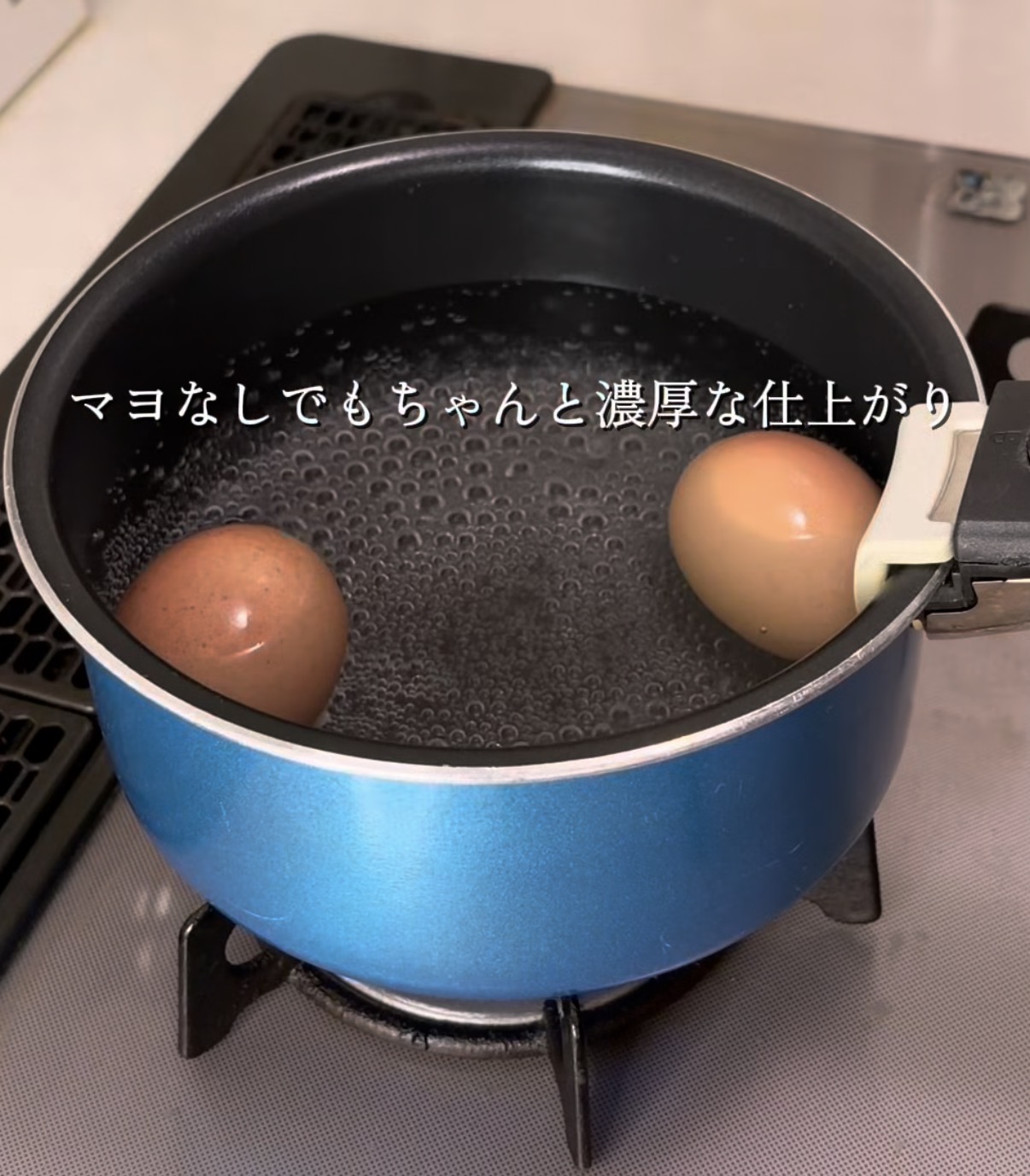 にんじんを温めている間に、卵を沸騰したお湯で7分半〜8分茹でて、ゆで卵を作っておきましょう。