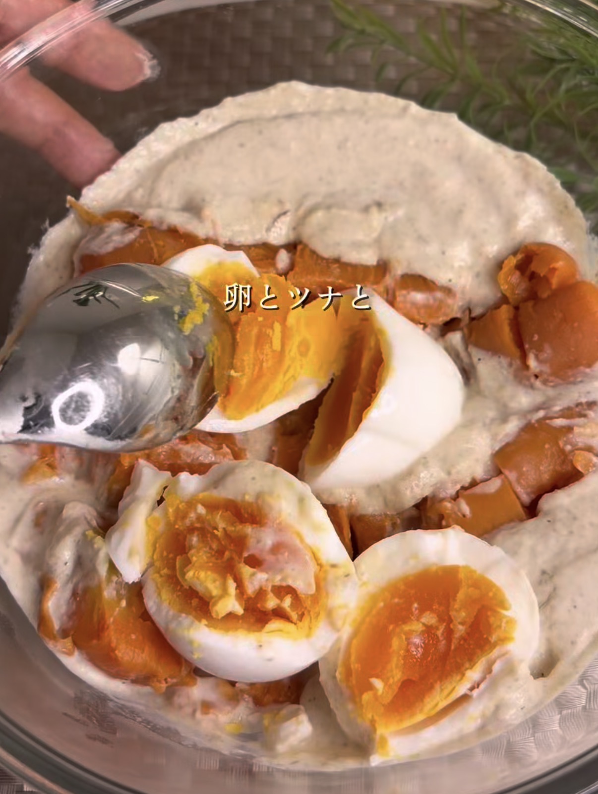 今回ご紹介するのは、にんじんの自然な甘みと、豆腐×味噌×胡麻で作るクリーミーなソースが絶妙に絡み合う『丸ごとニンジンクリーミーツナ卵サラダ』。