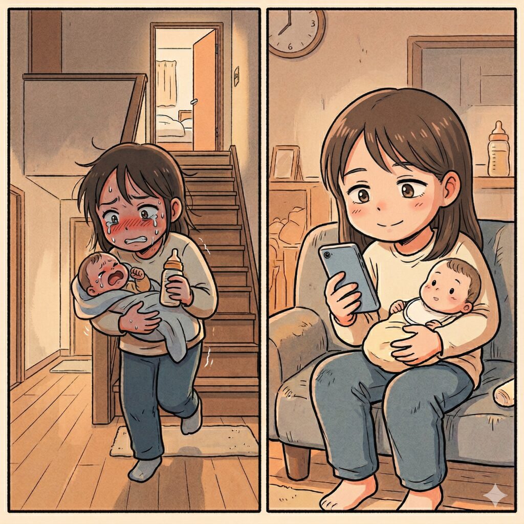 夜中、泣き出す子どもを一旦あやし、眠い目をこすりながら暗い階段を降りてミルクを作る。
