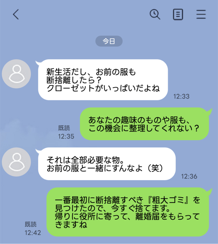 「新生活だし、お前の服も断捨離したら?」自分の服は捨てない夫からのメッセージ。だが、私が送った一文に思わず絶句