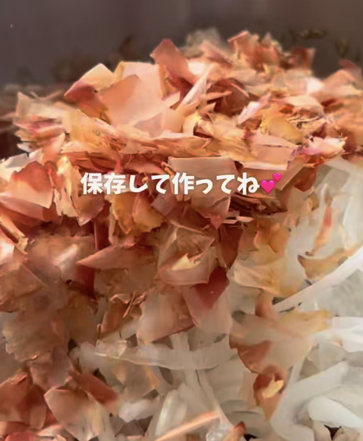 そこへ、STEP 1の玉ねぎ、STEP 2の豚肉、そしてかつお節を一気に投入!
