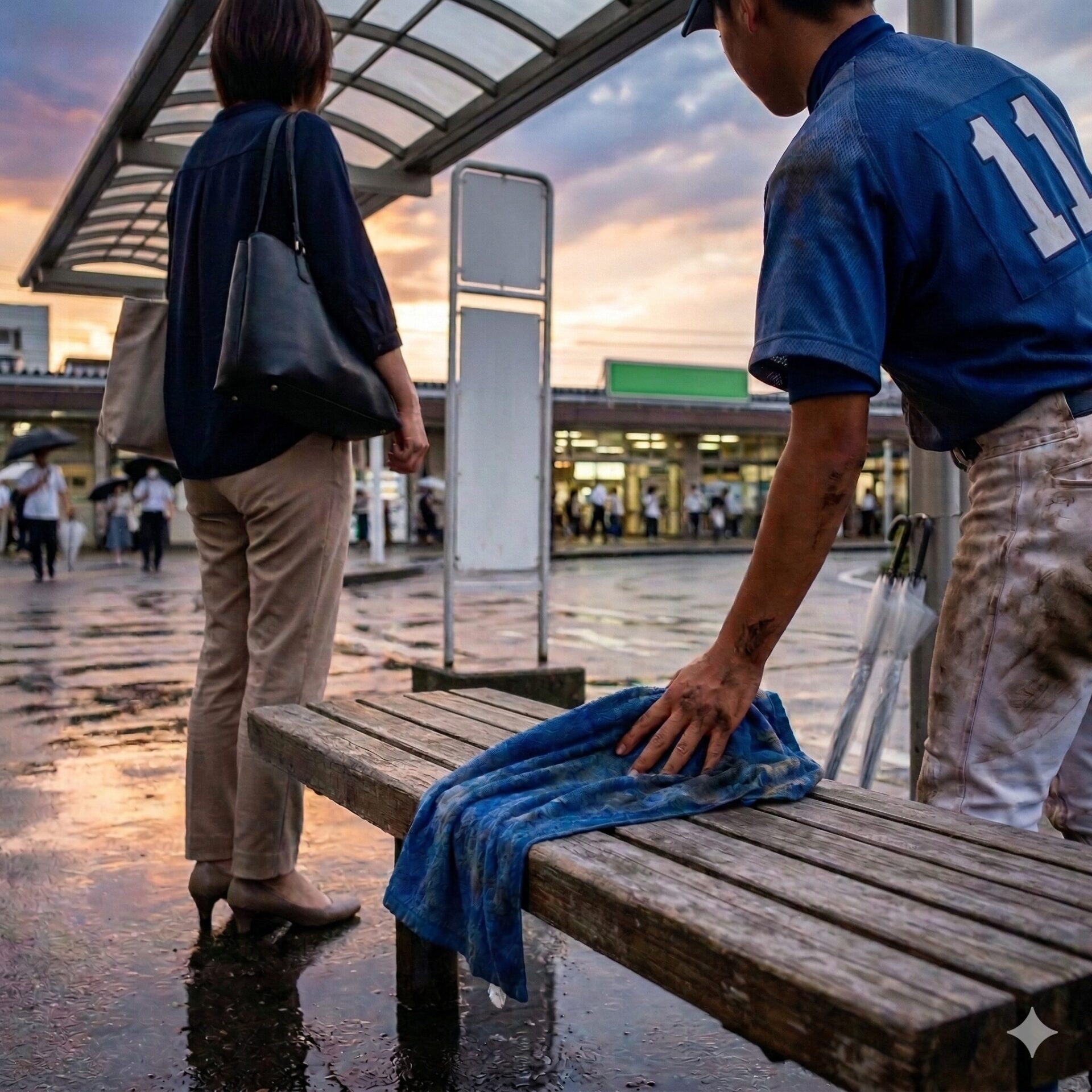 仕事で疲れた身体。「もう、限界かも」と座ろうとしたベンチが濡れていた。そんな困っている私を救った男子高校生の優しさ